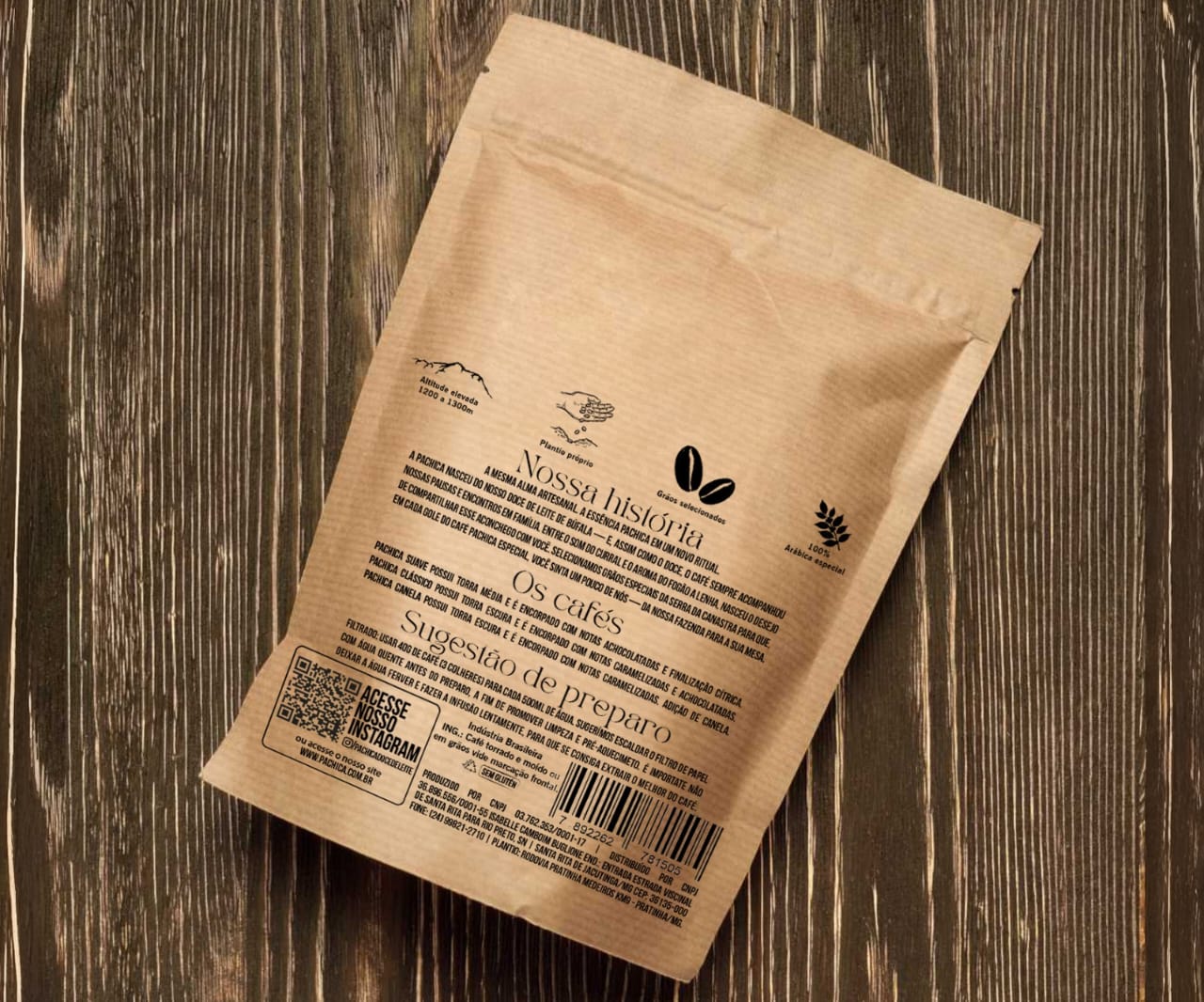 Grãos 100% arábica Bourbon, Mundo Novo e Catuaí Amarelo e Vermelho, cultivados nas montanhas de Minas Gerais, pontuação 84 pontos, torrados artesanalmente e embalados com todo o carinho da Fazenda Santa Fé, onde também produzimos o Doce de Leite Pachica.